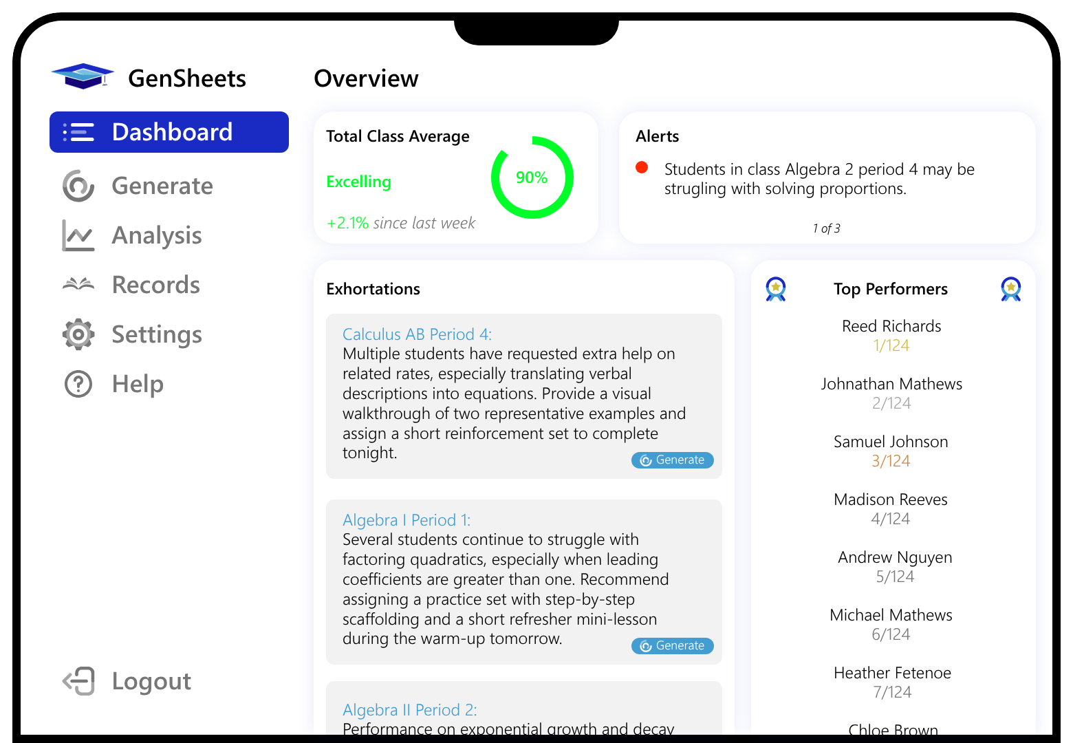 Our teaching assistant AI offers practical recommendations tailored to your students' progress. Get helpful insights about what's working and what might help students break through to the next level. It's support when you want it, giving you more time to focus on the classroom moments that matter most.