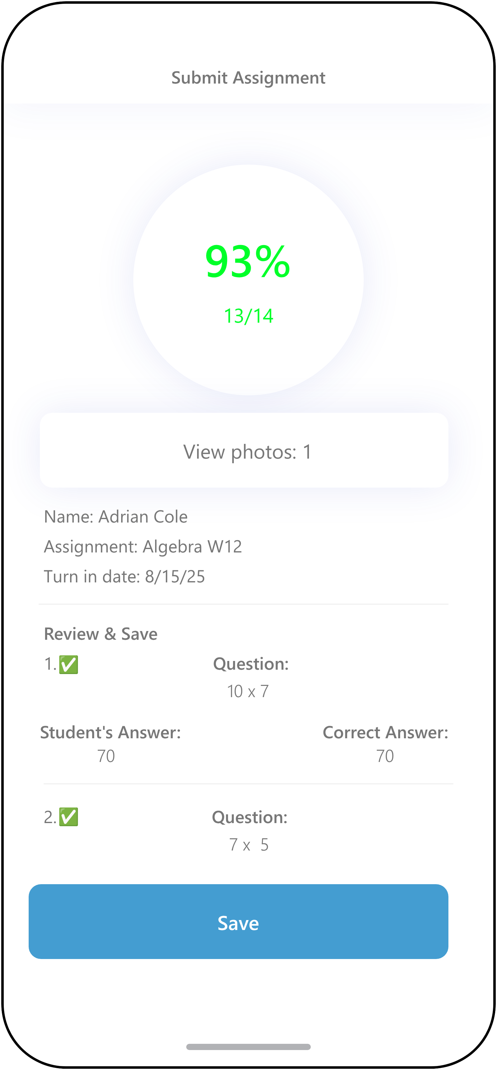 Upload single-page or multi-page assignments and get objective scoring in seconds. Our intelligent system analyzes each problem and delivers accurate grades instantly. What used to take hours of manual grading now happens in seconds, freeing up your time for instruction, planning, and working directly with students instead of being buried in paperwork.